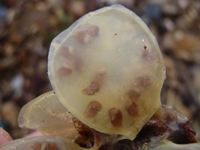 (2)海酸漿: 軟體動物腹足類的卵大都有膠質包裹著或包在囊殼中。這些螺貝於初夏產卵,群集於海中岩穴中。在日本小孩常把這卵囊殼撿來,當成酸漿果一樣吹著玩。